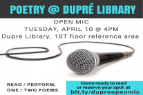 Dupre Library is hosting an Open Mic poetry session on Tuesday, April 10 at 4 pm. Come cheer on your peers or showcase your talent!!! Read or perform one to two poems. Drop in or reserve your spot at bit.ly/dupreopenmic