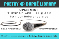 Dupre Library is hosting an Open Mic poetry session on Tuesday, April 24 at 4 pm. Come cheer on your peers or showcase your talent!!! Read or perform one to two poems. Drop in or reserve your spot at bit.ly/dupreopenmic