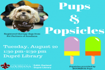 Welcome #Cajunsof2023! Join us in the library on Tuesday, August 20 at 1:30 for Pups & Popsicles, with registered therapy dogs from Pet Partners of Acadiana and gourmet popsicles from Boombox Frozen Pops and Ice Cream.