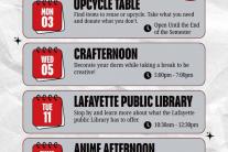 This month features the opening of the Upcycle Table, Crafternoon, a visit from the Lafayette Public Library, and Anime Afternoon.