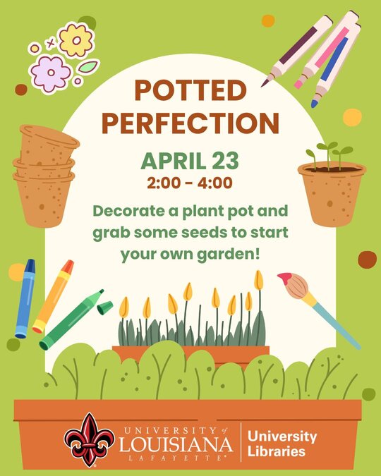 Thu, 04/23/2026 - 2:00pmStop by for Potted Perfection during Earth Week at the Make & Take Table across from the front service desk in Dupré Library at 2 p.m. – 4 p.m.!